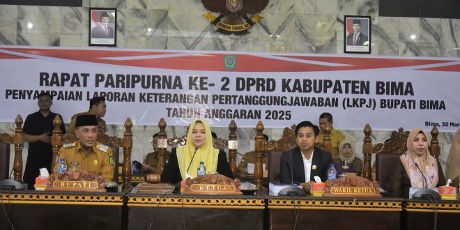 Kab Bima-MP-Dokumen Laporan Keterangan Pertanggungjawaban (LKPJ) tersebut disampaikan Senin (30/3) di Ruang Sidang Utama oleh Bupati Bima Ady Mahyudi dihadapan Rapat Paripurna Ke-2 DPRD Kabupaten Bima Masa Sidang 1 Tahun Sidang 2026 yang dipimpin oleh Ketua DPRD Kabupaten Bima Diah Citra Pravitasari, S.IP didampingi tiga unsur pimpinan yaitu, Wakil Ketua I Muhammad Erwin, S.IP. M.IP, Wakil Ketua II Ny. Murni Suciyanti dan Wakil Ketua III Muh. Nazarudin, SH.