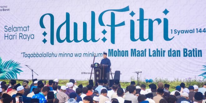 MATARAM-MP-Gubernur Nusa Tenggara Barat Lalu Muhamad Iqbal bersama jajaran Pemprov NTB menunaikan Sholat Idulfitri 1447 Hijriah, Sabtu (21/3/2026) di halaman Bumi Gora Provinsi NTB. Gubernur NTB Lalu Muhamad Iqbal menegaskan, bahwa Ramadan merupakan madrasah kehidupan yang mengajarkan umat untuk menjadi pribadi yang lebih sabar, berakhlak, dan peduli terhadap sesama.
